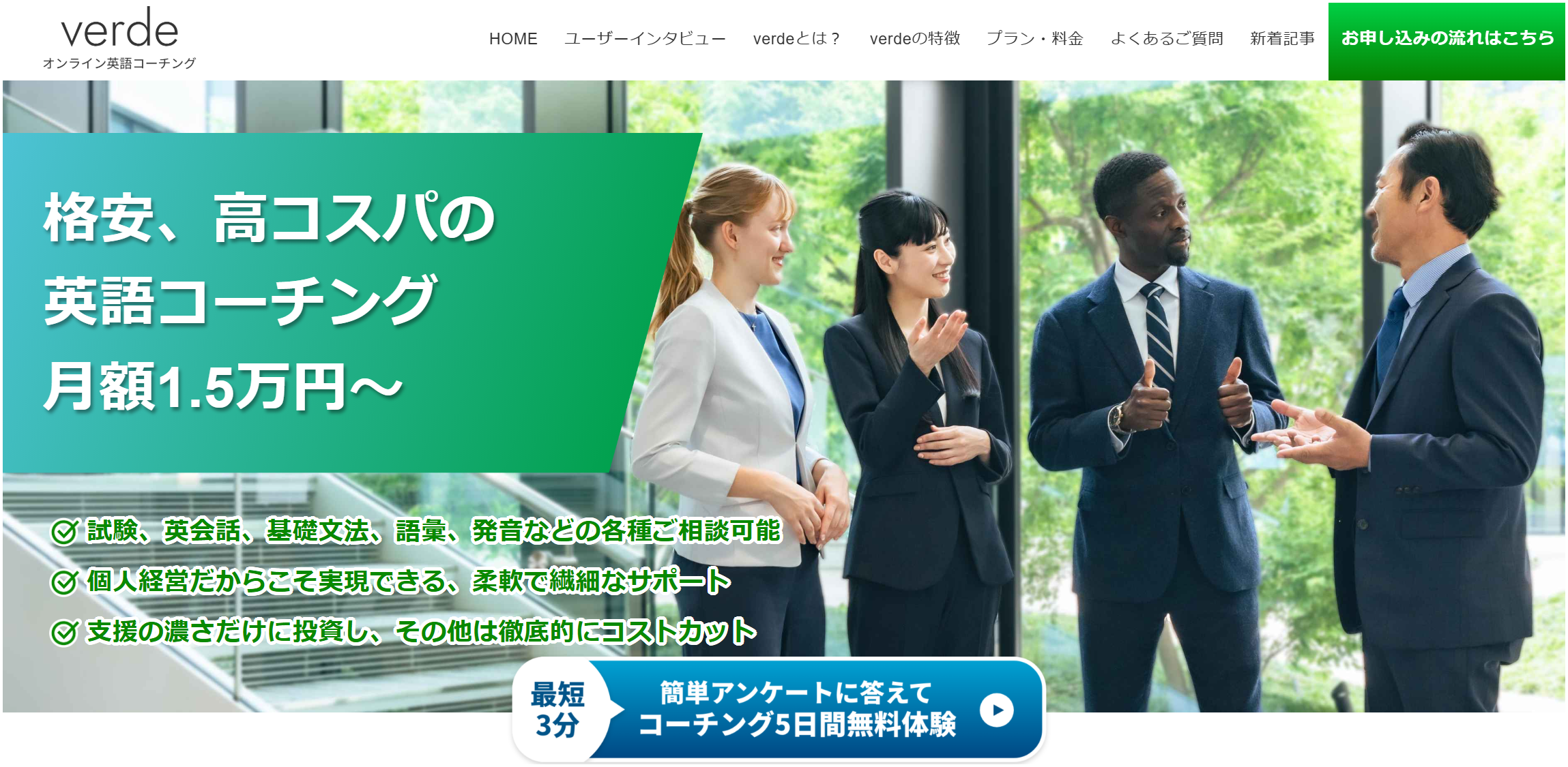 英語の勉強を続けたいのに続かない、何から手をつければいいかわからない。そんな悩みを抱える学習者のために設計されたのが、verde英語コーチングのベーシックプラン(月額15,000円)です。専属コンサルタントが日々伴走し、最適な方向性へ導きながら確実な前進を支えます。